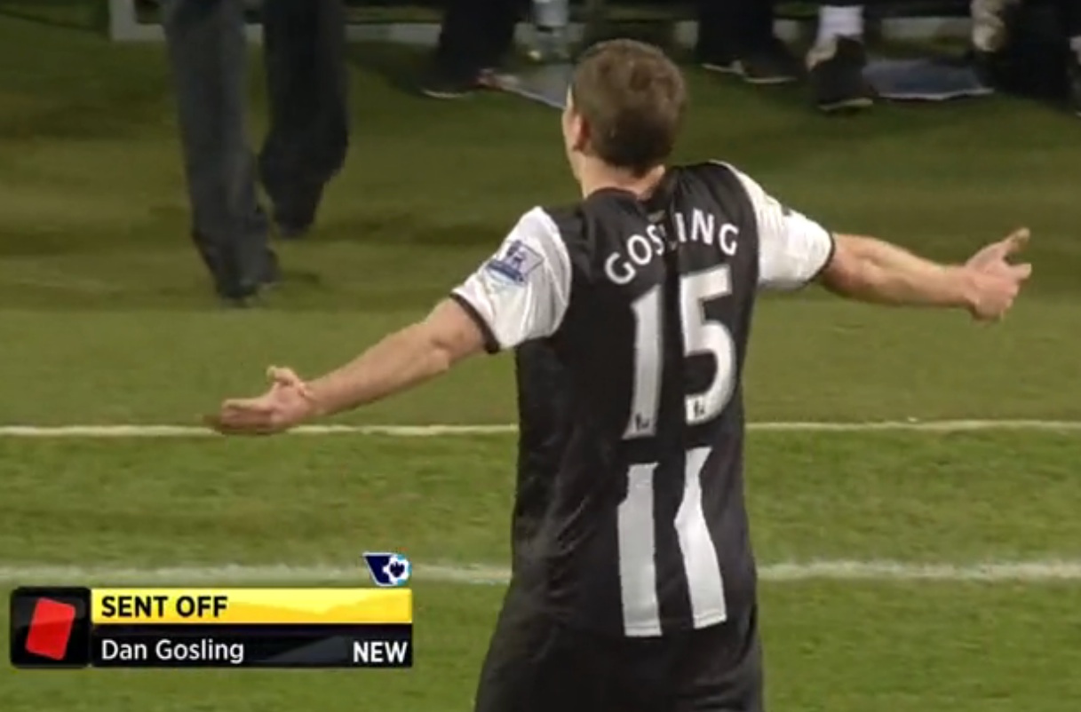 In the 66', Newcastle's Dan Gosling makes a cynical challenge (studs up and over the ball) on Norwich's Russell Martin.